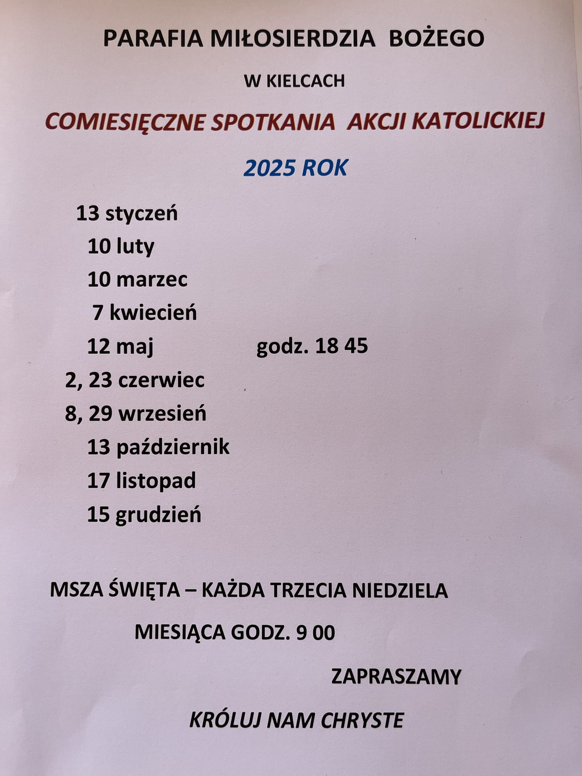 Na progu Roku Jubileuszowego pod hasłem PILGRZYMI NADZIEI, Akcja Katolicka Parafii Miłosierdzia Bożego w Kielcach przygotowała i wywiesiła na tablicy parafialnych ogłoszeń TERMINARZ KATECHEZ FORMACYJNYCH AKCJI KATOLICKEJ na rok 2025 rok.